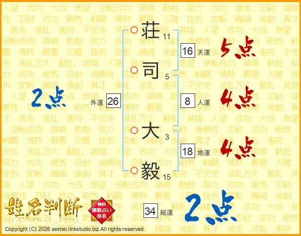 あなたの人生を表す1番重要な運勢です。生涯を通じて影響する総合運となり、主に50歳以降の晩年期に影響を及ぼします。苗字と名前の合計画数。