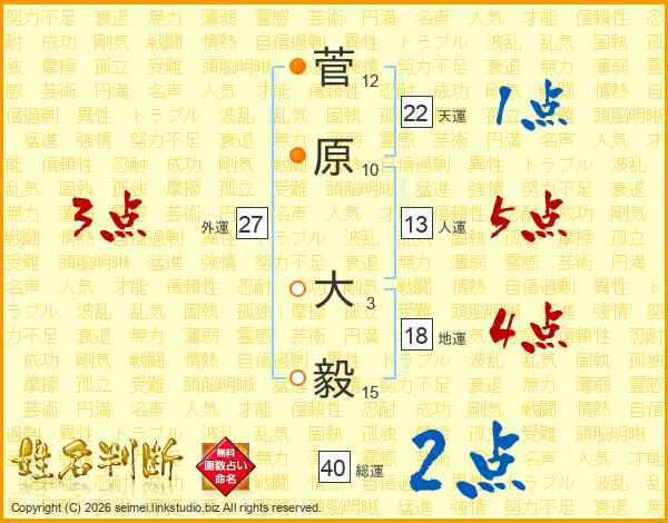 家系が持つ宿命的な運勢を表します。祖先から受け継いだ苗字ですので自分の力が及びません。家柄を象徴します。苗字の合計画数。