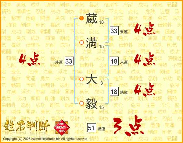 蔵(18画)満(15画) 大(3画)毅(15画)