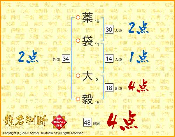 薬(19画)袋(11画) 大(3画)毅(15画)