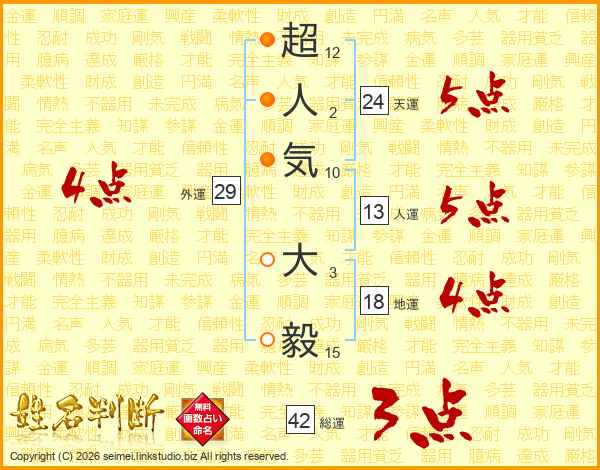 超(12画)人(2画)気(10画) 大(3画)毅(15画)