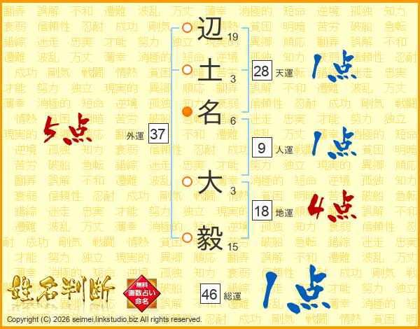 辺(19画)土(3画)名(6画) 大(3画)毅(15画)