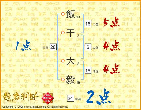 生活面を象徴する運勢です。外部から受ける影響力を表し、結婚運、家庭運や職場、環境への順応性を表します。総運から人運を引いた画数。姓や名が1文字の場合を除く。