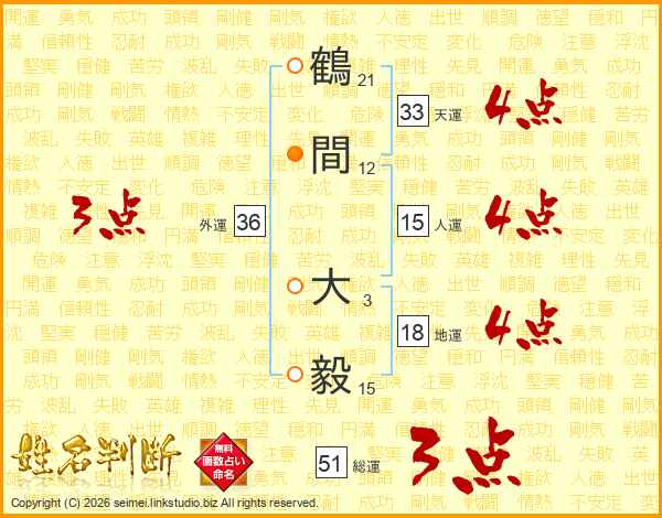 鶴間大毅さんの天運は33画の4点!