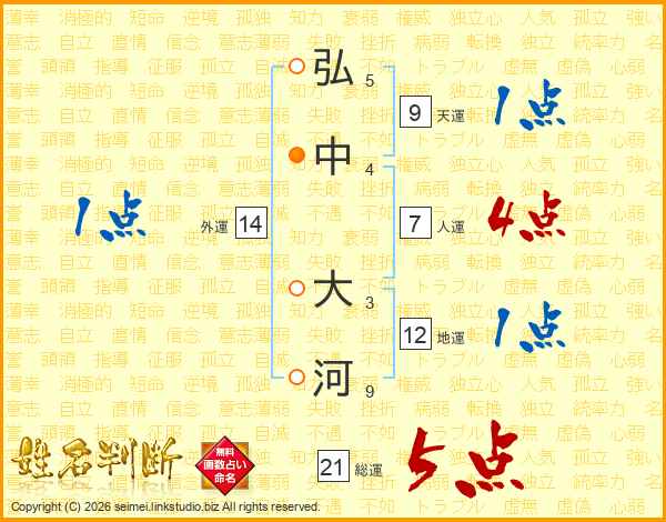生活面を象徴する運勢です。外部から受ける影響力を表し、結婚運、家庭運や職場、環境への順応性を表します。総運から人運を引いた画数。姓や名が1文字の場合を除く。