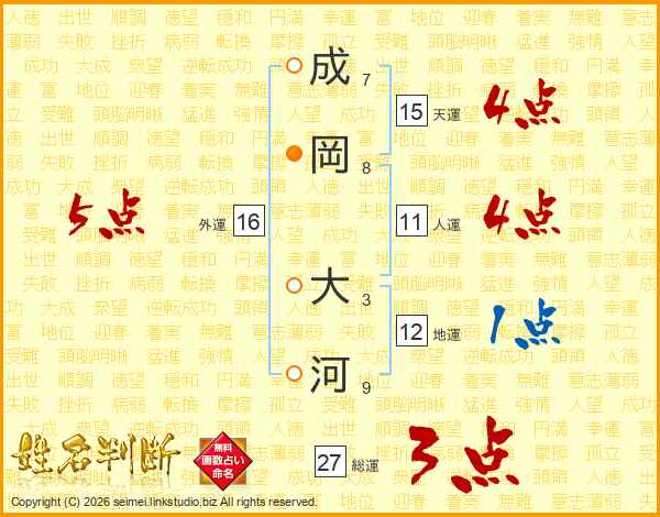 成(7画)岡(8画) 大(3画)河(9画)