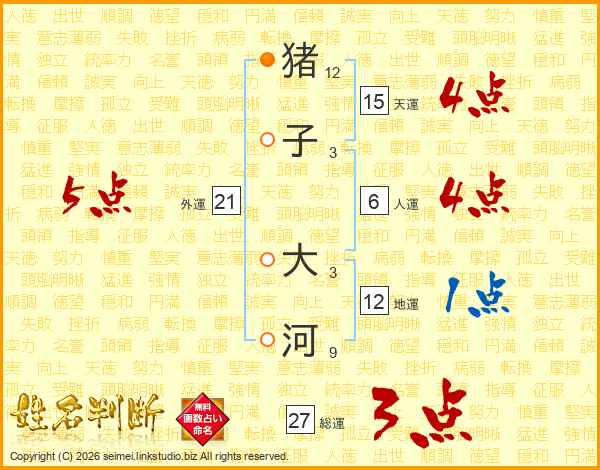 あなたの人生を表す1番重要な運勢です。生涯を通じて影響する総合運となり、主に50歳以降の晩年期に影響を及ぼします。苗字と名前の合計画数。