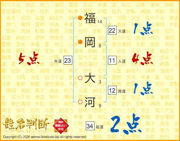 福(14画)岡(8画) 大(3画)河(9画)