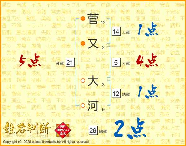 生活面を象徴する運勢です。外部から受ける影響力を表し、結婚運、家庭運や職場、環境への順応性を表します。総運から人運を引いた画数。姓や名が1文字の場合を除く。