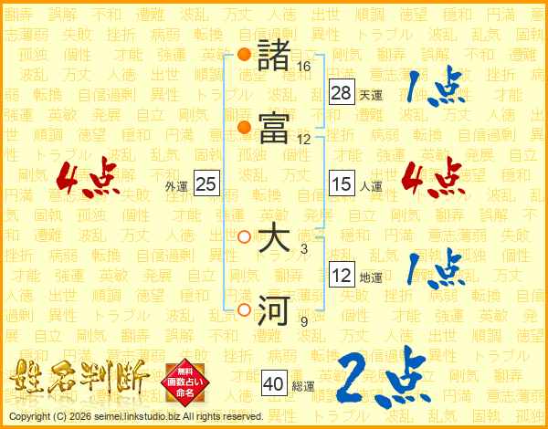 生活面を象徴する運勢です。外部から受ける影響力を表し、結婚運、家庭運や職場、環境への順応性を表します。総運から人運を引いた画数。姓や名が1文字の場合を除く。
