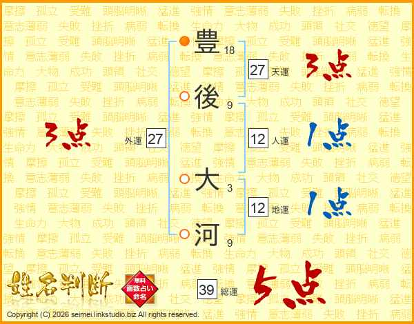 家系が持つ宿命的な運勢を表します。祖先から受け継いだ苗字ですので自分の力が及びません。家柄を象徴します。苗字の合計画数。