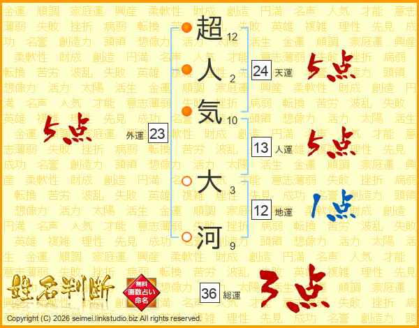 超(12画)人(2画)気(10画) 大(3画)河(9画)