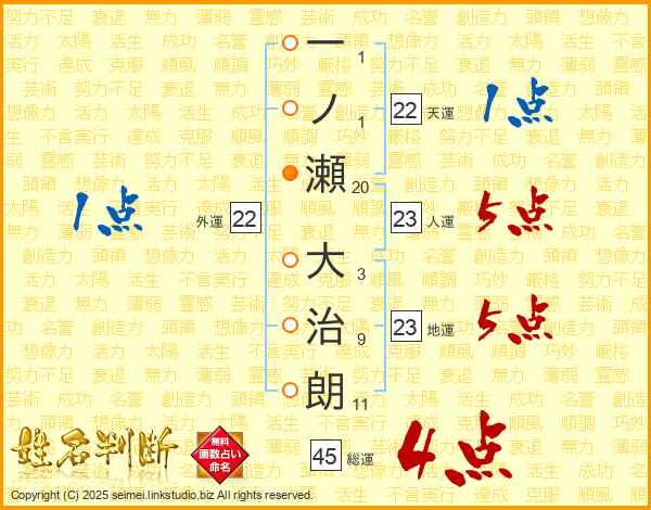 一(1画)ノ(1画)瀬(20画) 大(3画)治(9画)朗(11画)