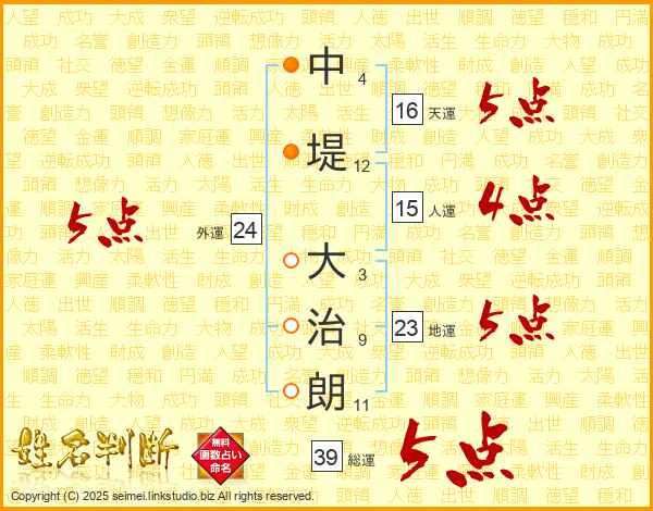 中(4画)堤(12画) 大(3画)治(9画)朗(11画)