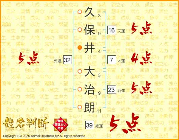 久(3画)保(9画)井(4画) 大(3画)治(9画)朗(11画)