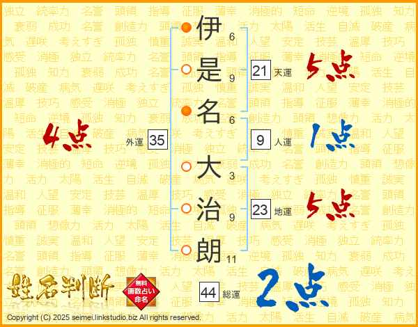 伊(6画)是(9画)名(6画) 大(3画)治(9画)朗(11画)