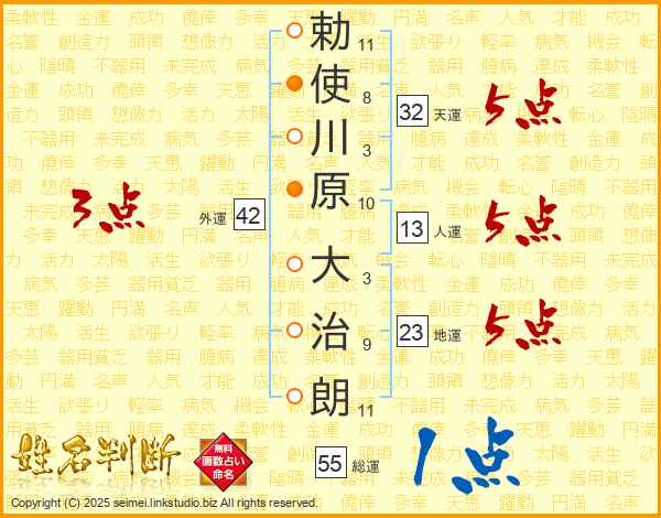 勅(11画)使(8画)川(3画)原(10画) 大(3画)治(9画)朗(11画)