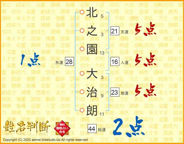 北(5画)之(3画)園(13画) 大(3画)治(9画)朗(11画)