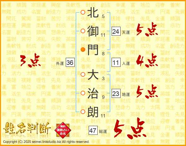 北(5画)御(11画)門(8画) 大(3画)治(9画)朗(11画)