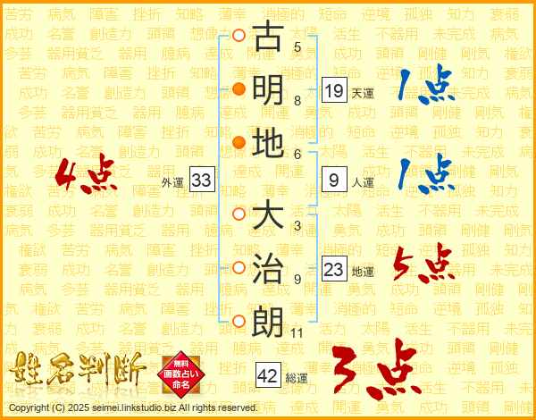 古(5画)明(8画)地(6画) 大(3画)治(9画)朗(11画)