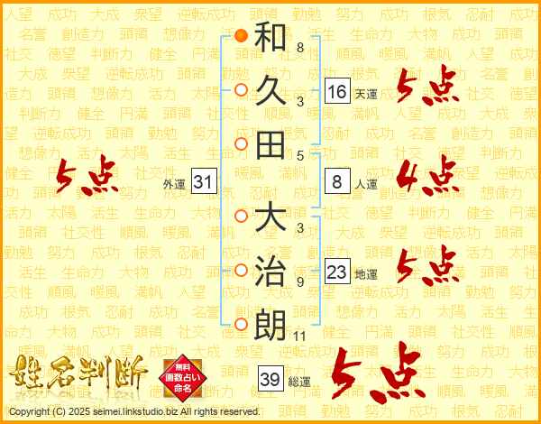 和(8画)久(3画)田(5画) 大(3画)治(9画)朗(11画)