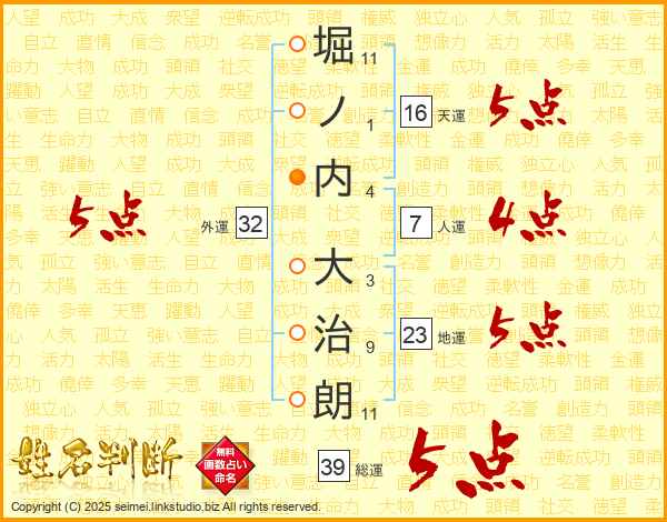 堀(11画)ノ(1画)内(4画) 大(3画)治(9画)朗(11画)