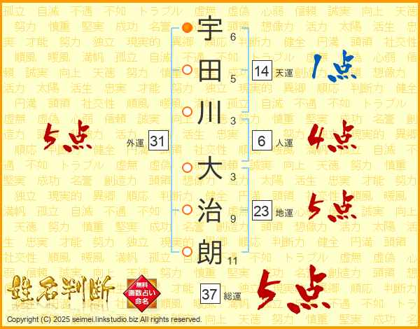 宇(6画)田(5画)川(3画) 大(3画)治(9画)朗(11画)
