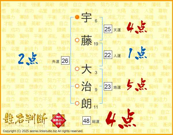 宇(6画)藤(19画) 大(3画)治(9画)朗(11画)
