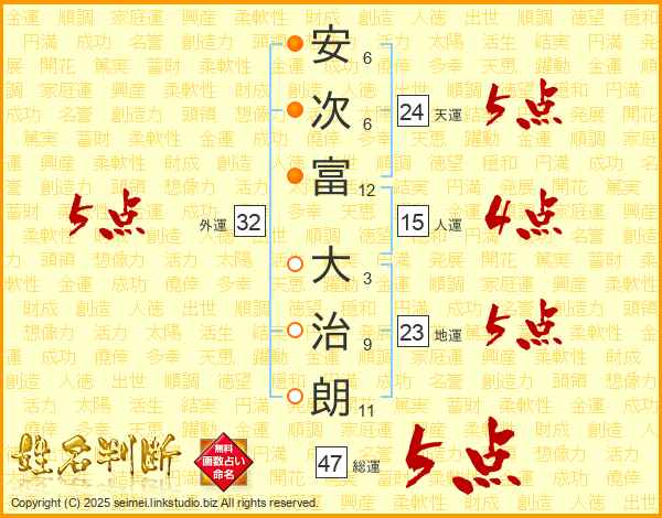 安(6画)次(6画)富(12画) 大(3画)治(9画)朗(11画)