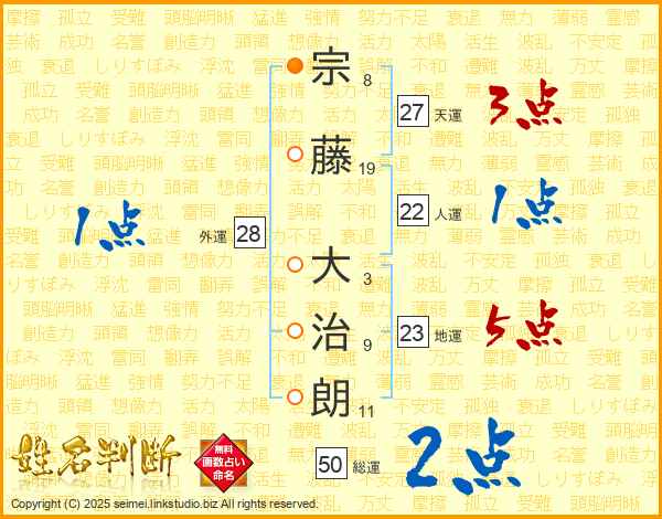 宗(8画)藤(19画) 大(3画)治(9画)朗(11画)