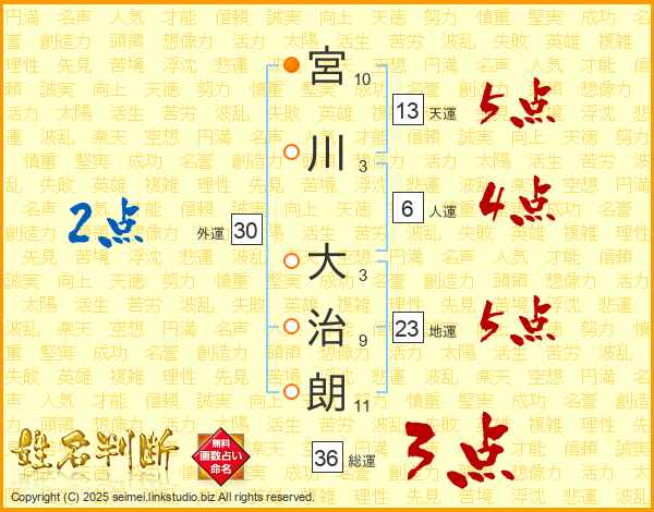 宮(10画)川(3画) 大(3画)治(9画)朗(11画)