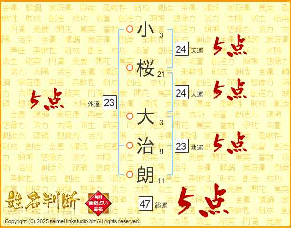 小桜大治朗さんの総運は47画の5点!