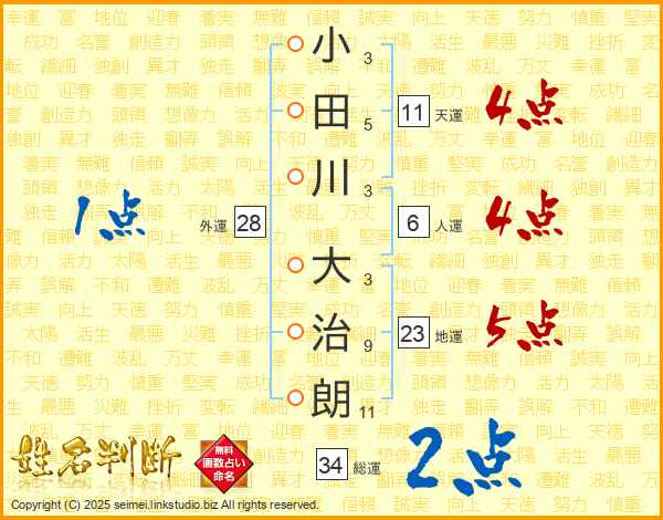 小(3画)田(5画)川(3画) 大(3画)治(9画)朗(11画)