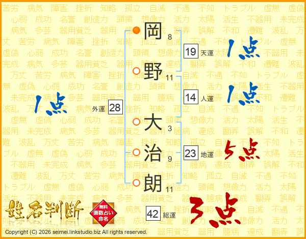 岡(8画)野(11画) 大(3画)治(9画)朗(11画)