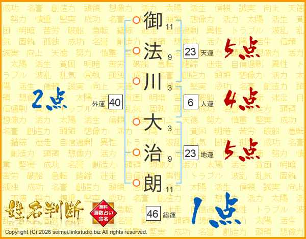 御(11画)法(9画)川(3画) 大(3画)治(9画)朗(11画)