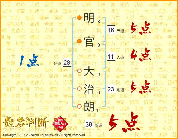明(8画)官(8画) 大(3画)治(9画)朗(11画)