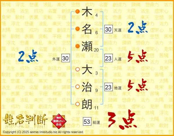木(4画)名(6画)瀬(20画) 大(3画)治(9画)朗(11画)