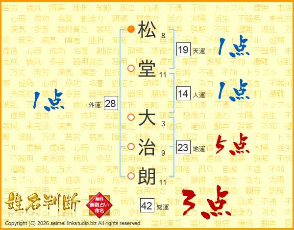 松(8画)堂(11画) 大(3画)治(9画)朗(11画)