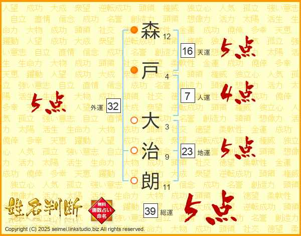 森(12画)戸(4画) 大(3画)治(9画)朗(11画)