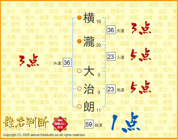 横(16画)瀧(20画) 大(3画)治(9画)朗(11画)