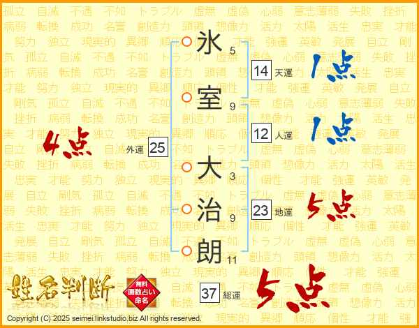 氷(5画)室(9画) 大(3画)治(9画)朗(11画)