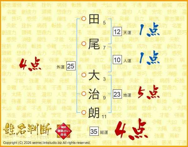 田(5画)尾(7画) 大(3画)治(9画)朗(11画)