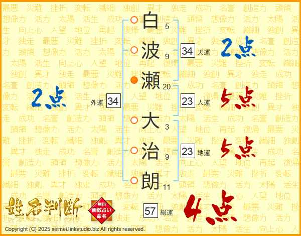 白(5画)波(9画)瀬(20画) 大(3画)治(9画)朗(11画)