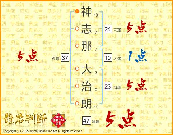 神(10画)志(7画)那(7画) 大(3画)治(9画)朗(11画)