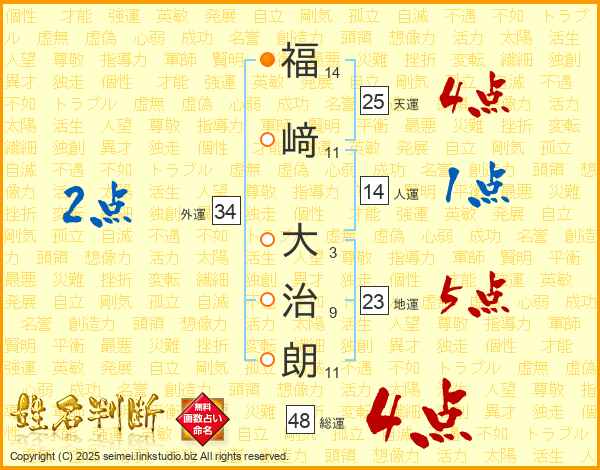 福(14画)﨑(11画) 大(3画)治(9画)朗(11画)
