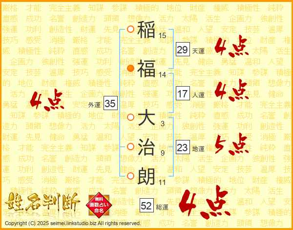 稲(15画)福(14画) 大(3画)治(9画)朗(11画)