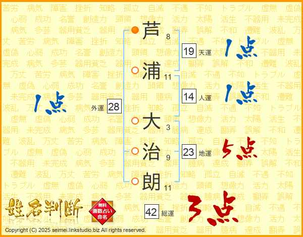 芦(8画)浦(11画) 大(3画)治(9画)朗(11画)