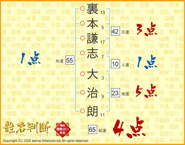 裏本謙志大治朗さんの総運は65画の4点!