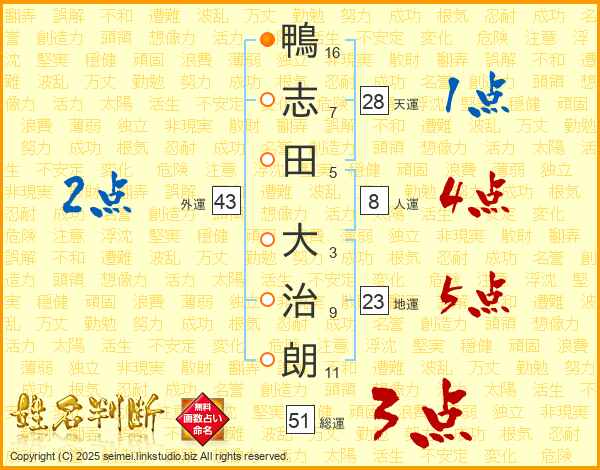 鴨(16画)志(7画)田(5画) 大(3画)治(9画)朗(11画)