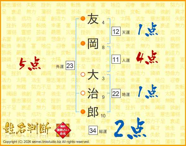 友(4画)岡(8画) 大(3画)治(9画)郎(10画)